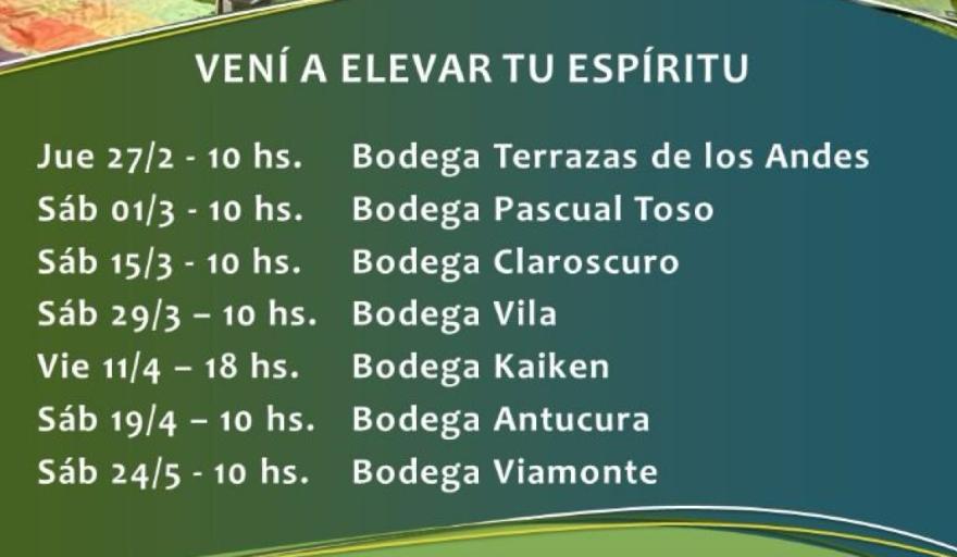 El ciclo anuncia una serie de encuentros en bodegas de Luján, Maipú y Tunuyán. Prácticas de ejercicios físicos combinados con la respiración y un broche final con gastronomía y vinos en un clima de total armonía.