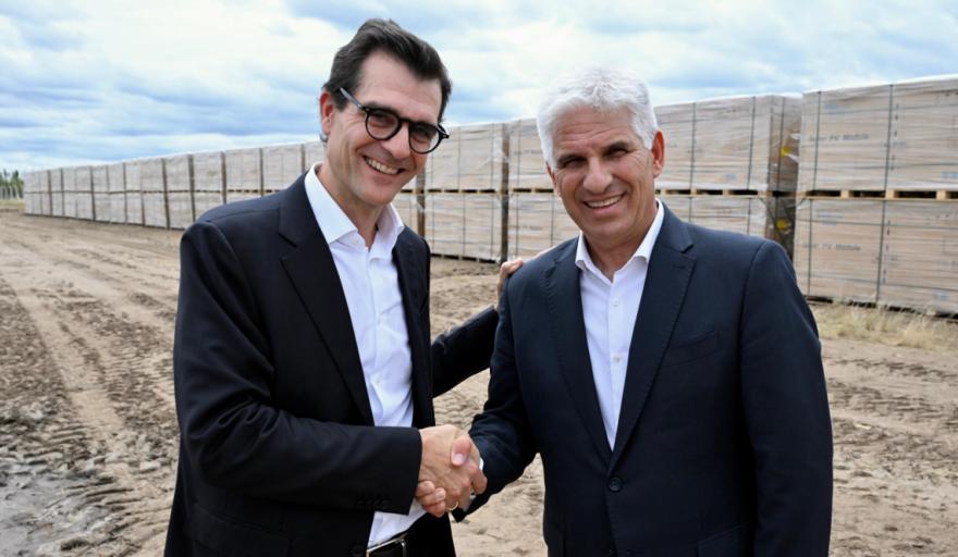 10:05 |El gobernador de San Luis, Claudio Poggi, y el CEO y fundador del grupo, Juan José Retamero, recorrieron el sitio del futuro parque solar de 51 MW en Nogolí, tras la reciente llegada de 44 contenedores con paneles importados.